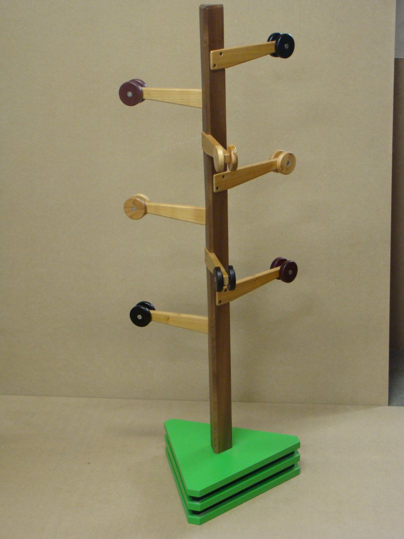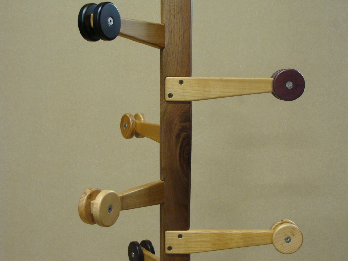 Valet Encombrement : Hauteur : 1m23 Longueur / Largeur : 48 cm 8 supports - socle laqué et lesté Bois massif, essences variées, Sycomore, Ebène de Macassare, Noyer, Amarante, Merisier, Orme Prix à empoter : 280 euros TTC Photos